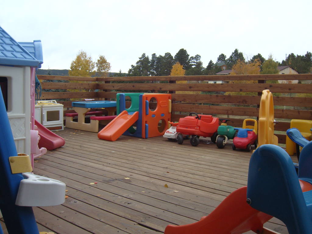 This is the deck and there is a very large fenced in yard with a soft surface playground.